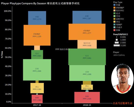忽然间,已经是一个接近20+10的新生代内线了。而且,这数据,很实在。场均10.4个篮板,有3.9个前场篮板,竞争性篮板率47.6%,在至少场均抢到10个篮板的球员中,仅次于安德鲁-德拉蒙德。场均18.4分,真实命中率高达62%,作为参考,克林特-卡佩拉的真实命中率是64%。当然了,就像卡佩拉没少吃哈登送出的饼,柯林斯的进攻也从特雷-杨处得益——杨的三分手感至今无从寻觅,但梳理进攻,却颇有纳什神韵。反过来,有了柯林斯抗进攻大梁之后,特雷-杨也减少了不着边际的三分出手,于是老鹰能赢球了。