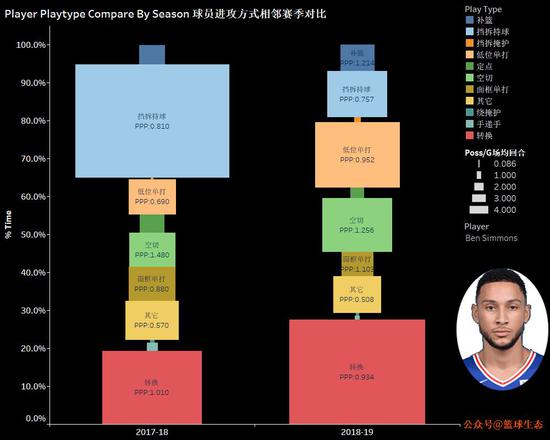 挡拆持球就更诡异,通常出手数与命中率是矛盾体,能同时增加则可以大胆认为是进步了,两者一增一减则具体情况具体分析。像西蒙斯这样,回合数减少了,效率也降低了,却是咄咄怪事。不过,结合他赛季至今一个三分都没投,也就合理了——随便你怎么挡,我在近框堆积人即可。