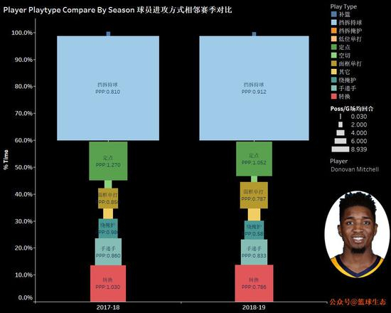 挡拆持球进攻,作为进攻发起者的利器,做到了质量俱增(同色矩形长度增大代表相应进攻方式场均回合数增多,宽度增大代表占比增大,下文同),仅凭这一点,还远远不到对米切尔失望的时候。