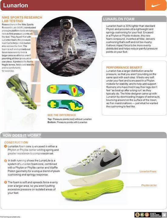 相信大家都知道,Nike Lunarlon系列跑鞋又被称作“登月”,该系列鞋款被形容有着“在月球中行走”的脚感。2008年,Lunarlite Foam科技诞生,据说这项科技由Nike和NASA共同研发了36年,Nike旗下Lunarlon在内的多种科技都由此发展而来。