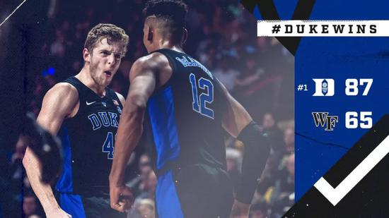 在今天早些时候结束的一场NCAA比赛中,杜克大学以87-65战胜邓肯的母校维克森林大学,以12胜1负继续高歌猛进!