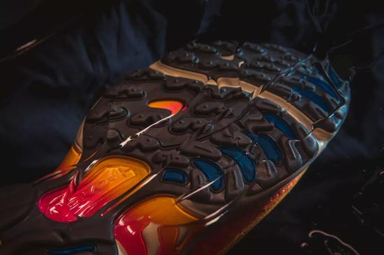 虽然 Russell Westbrook 多年前就成为了 Jordan Brand 代言人,但是他本赛季的个人签名篮球鞋都被外界一致认为是 Jordan Brand 近年来为其推出的所有场上及场下签名鞋中最为出色的。这双鞋完全摆脱了往年品牌为旗下代言人在推出签名鞋时侧重以当年正代鞋款或过往经典鞋款为参考进行设计的惯例。首发配色更是以鲜艳的大色块拼接呈现,每一个色块都影射了对于 Westbrook 职业生涯所穿着过的球衣,以这种形式记录着他的篮球生涯和背后的故事。中底部位也做了切割处理,一抹鲜艳的黄色进行衔接,从视觉效果的角度出发,第一眼锁定的便是这个部位。鞋标部位也做出了球鞋历史上前所未有的突破,被直接置于外底之上。而用仰视的角度再来看这双近期最为引人关注的实战鞋款,凌驾于天空和墙面之间,如果说照片中的球鞋呈现了挑战引力,突破维度的感觉,那么球鞋的主人飞翔在篮球场上是也亦是如此。