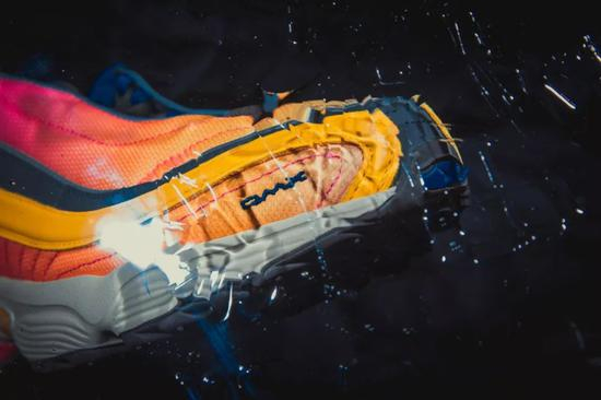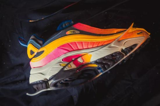 Bodega x Reebok DAYTONA DMX 本身就有着流动的鞋面线条,‘Shanghai Pack’ 配色大面积的暖色调着色与其流动的外观组合在一起显得十分契合。而中底内镶嵌的 DMX 缓震系统最为令人熟知的特性也是具有流动性的气囊。这些点组合在一起使得这双鞋完全可以用‘流动’来形容。当照片中的 DAYTONA DMX 在光线的效果形成了变形和扭曲时,它反而显得更加‘生动’。由橙色向粉色逐渐过渡的鞋面与中底衔接处宛如光线折射下的夕阳,同样是充斥着 90s 风格的跑鞋,在这个视角下,这双鞋完全不输去年大热的 Sean Wotherspoon x Nike Air Max 1/97。