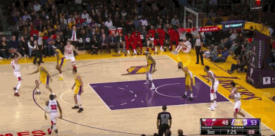 第三节7分48秒到7分18秒的30秒里连续两次在外线三分百步穿杨,一举将分差拉开到8分,逼得公牛叫了暂停。第三节5分钟又是鲍尔篮下补篮得分,外线接英格拉姆传球三分空心入网,再次逼停了公牛。