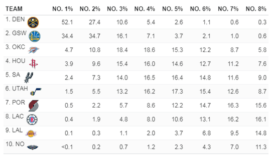 以下图表展示的是目前西部前十球队获得前八对应的可能性: