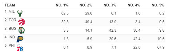 在季后赛席位争夺上,与狂野西部相比,东部的形势相对明朗。而下半赛季的东部更应该关注的是排名前五的球队对于季后赛首轮主场优势的争夺。目前猛龙、雄鹿、步行者、76人以及凯尔特人队都在为前四争得头破血流。以下是对于这五支球队获得前四对应的几率。