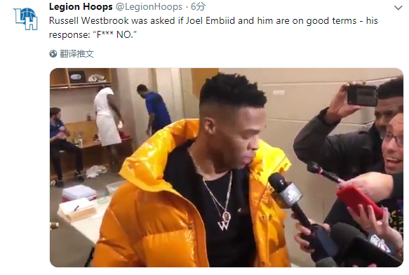 赛后接受采访时,有一位记者问威少他和恩比德之间的关系是否依然还OK,结果威少直接爆粗:“F***,不(OK)。”