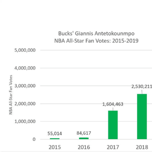 从这张图表我们可以看到字母哥在过去5年全明星投票中的球迷得票。