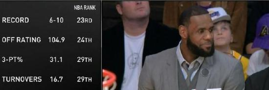 第三节的现场大屏幕数据显示,没有老詹,湖人6胜10负的战绩排在联盟第23位、进攻效率104.9排在联盟第24位、三分命中率31.1%排在联盟第29位、场均失误16.7次排在联盟第29位。