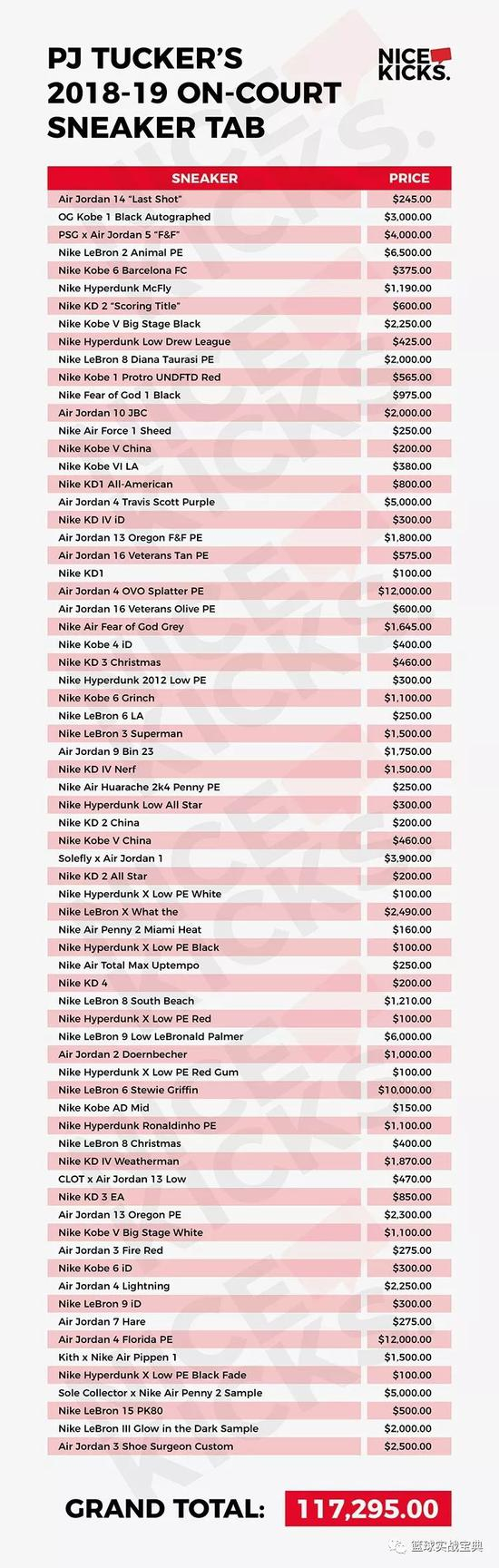 更细心的是,这家美国媒体还统计了塔克每一双球鞋在市场上的价格,最后统计出,塔克本赛季上脚的球鞋,总价值达到惊人的117295美元!