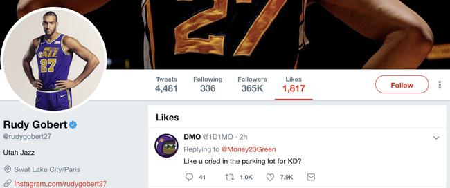 随后,一位名叫DMO的球迷在评论中写道:“就像你在停车场因为杜兰特哭吗?”