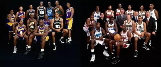 90年代最后两届全明星,联盟在球衣上又做出了新一轮大胆尝试。人们看到,无论是1997年克利夫兰的“摇滚乐”主题,还是1998年纽约全明星的“百老汇”氛围,场上的东、西部全明星们,不再穿着此前那种统一设计的球衣,而是身着各自球队的战袍。
