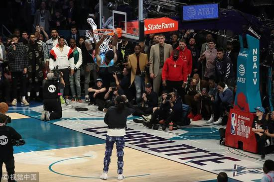 哈米杜-迪亚洛的动作简洁有力、一次成功,但在完成的干脆利落的同时却也稍显简单,纵然迪亚洛与队友们做起了夸张的庆祝动作,却还未能点燃现场的气氛。当然,扣篮大赛才刚刚开始,这不过是迪亚洛小试牛刀。