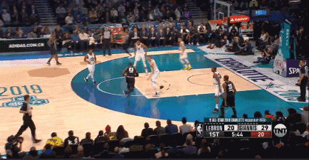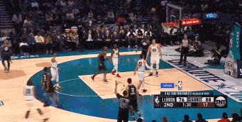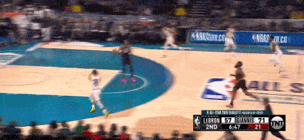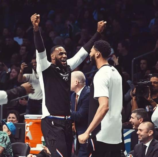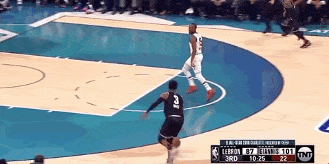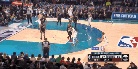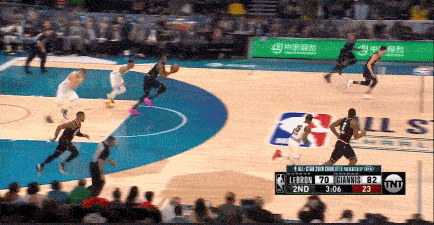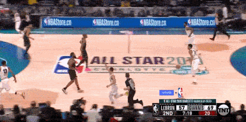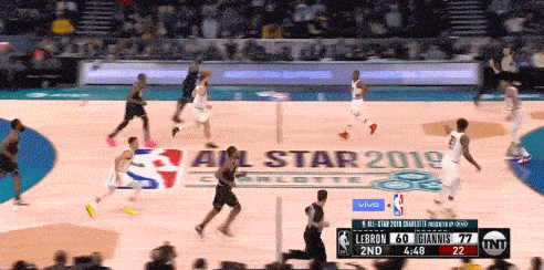 詹欧连线,直到第四节才上演,久违的感觉。此时的詹姆斯队领先字母哥队多达10分,距离比赛还有最后3分钟。
