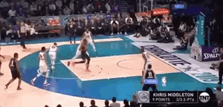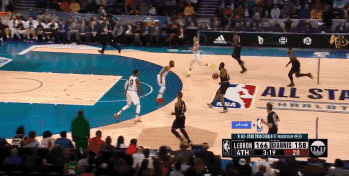 库里小碎步击地高传球,字母哥单手空接砸扣,保罗-乔治上演360度的单手劈扣,字母哥队用一次次的狂轰滥炸拉开与詹姆斯队的分差。