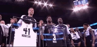 随着詹姆斯队开始狂飙三分,他们在第三节结束以132-131反超1分。诺维茨基和韦德在休息阶段领到了纪念版全明星球衣,其他球员站在身后,詹姆斯则与韦德站在一起强行蹭合影。
