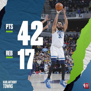 此役森林狼内线唐斯全场29投15中,爆砍42分17篮板,据统计这是唐斯生涯第5次砍下40+,超越加内特(4次),升至队史第三。