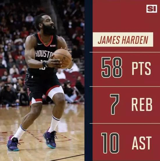 对阵热火的比赛中,哈登砍下了58分6篮板10助攻4抢断的神级数据带领球队获得比赛胜利。这已经是哈登本赛季第2次砍下58分了,也是本赛季第6次砍下50+了,更是生涯第15次砍下50+的分数。