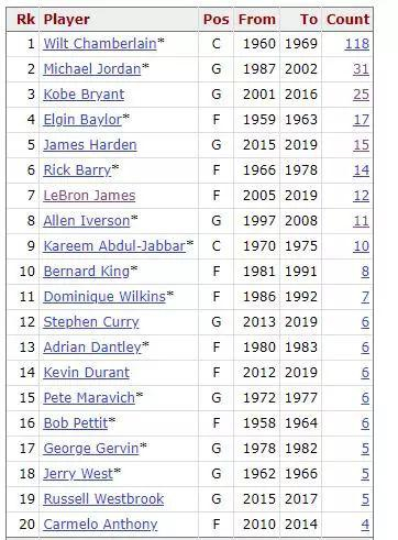 NBA得分50+次数排行:科比乔丹加起来不如一人