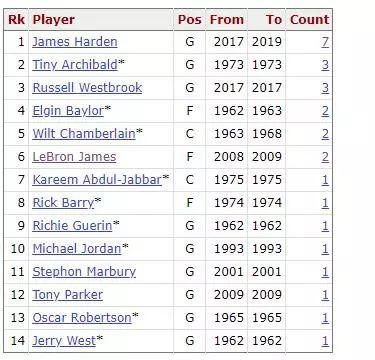我们再回归现实说回哈登,哈登生涯一共获得15次50+排名历史第五是现役球员中最强的存在。就和热火的比赛而言,哈登不仅仅得分50+,他还同时奉献了10次助攻。如果我们把条件改成得分50+同时助攻10+的话,哈登生涯一共7次获得这样的数据排名历史第一,这7次中有4次是同时篮板也上双的大三双。威少生涯一共砍下3次并列历史第2,詹姆斯一共砍下2次并列历史第3。