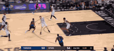 这场比赛有一个令我印象最为深刻的防守回合:珀尔特尔篮下防守往篮筐方向突破的威斯布鲁克,然后逼迫其向外线分球,接着怀特从一侧杀出将传球抢断。充分诠释了珀尔特尔和怀特的防守组合能够给马刺带来的加成。