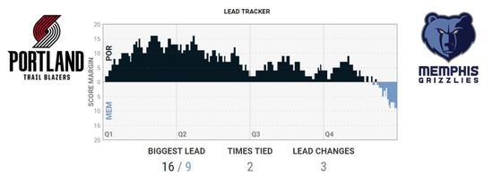 本场比赛,开拓者队几乎领先了灰熊队一整场比赛,最多的时候领先了灰熊队多达16分。