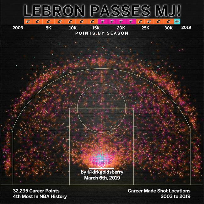 北京时间3月8日消息,洛杉矶湖人主场99比115不敌丹佛掘金,勒布朗-詹姆斯在比赛中实现了一个里程碑时刻,他成功超越迈克尔-乔丹升至历史得分榜第4位。有热心球迷特意做出了詹姆斯生涯投篮进球的分布图,人们可以清楚地看出篮下区域是他最喜欢的进攻位置。