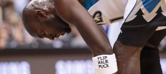 KG生涯末段护臂上的三行字,分别代表他失去的三位一生挚友:教练Flip Saunders,队友Malik Sealy和棒球明星Kirby Puckett