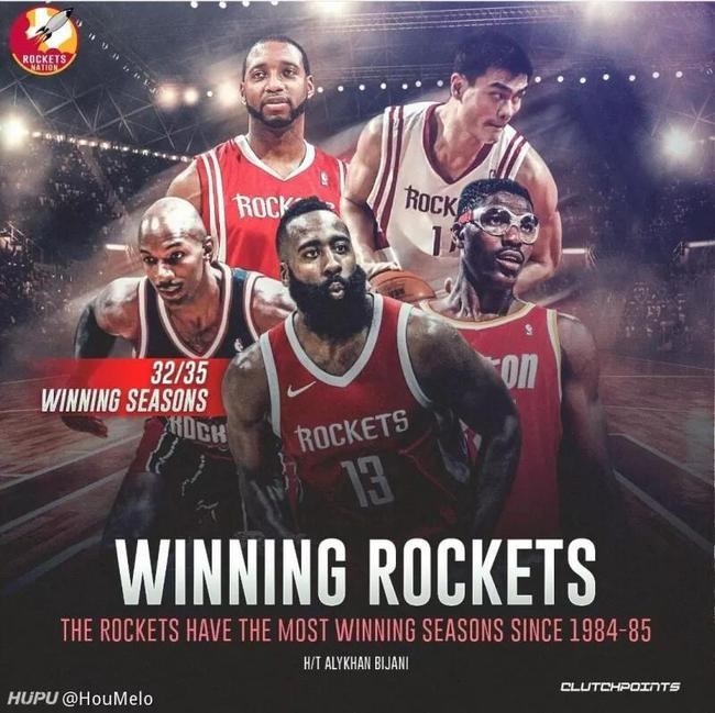北京时间3月15日,《Clutch Points》的休斯顿火箭跟队记者Alykhan Bijani今天发布了火箭队史最佳五虎的图,并称火箭自1984-85赛季以来的35个赛季,有32个赛季胜率不低于5成,同时期NBA最多。