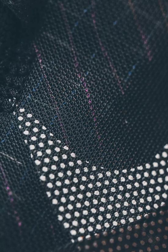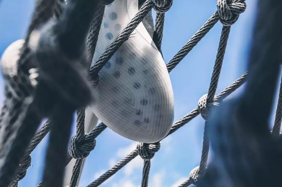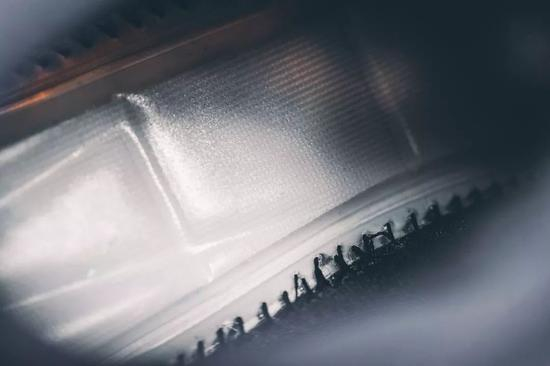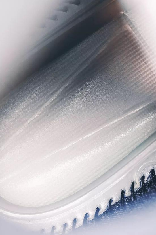 在鞋身内侧区域设有一个圆形小透明圈,在圈内可以看到鞋面内部密集而规律的的Flywire飞线材质包覆整个鞋面,不同走向的飞线材质也以黄、蓝、紫三种颜色呈现,轻质且耐用的Flywire飞线科技也给鞋身带来强有力的支撑性及包裹性。