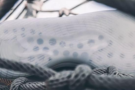 打造了穿孔式的Phylon中底,并在后跟部分镶嵌了一款六边形的气垫(也就是上文所提到的双层气垫结构),穿孔式Phylon中底的加入,能带动后跟部分的六边形气垫,并使鞋身缓震性能更进一步,从而提高了鞋款的舒适程度。