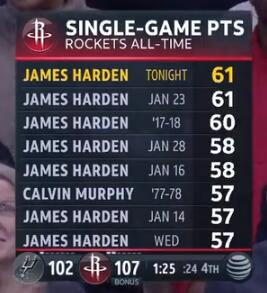 北京时间3月23日,在今天休斯顿火箭主场以111-105力克圣安东尼奥马刺的比赛中,詹姆斯-哈登狂砍61分,不但追平生涯纪录,且创下了一系列彪炳的纪录。