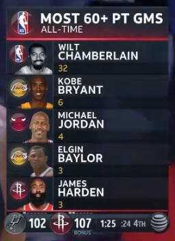 61分追平哈登生涯单场得分纪录,上一次是在今年1月24日客战尼克斯。此外据统计,这是哈登生涯第3次单场得分60+,也就此追平埃尔金-贝勒,并列NBA历史第4位,仅次于威尔特-张伯伦(32场)、科比-布莱恩特(6场)和迈克尔-乔丹(4场)。