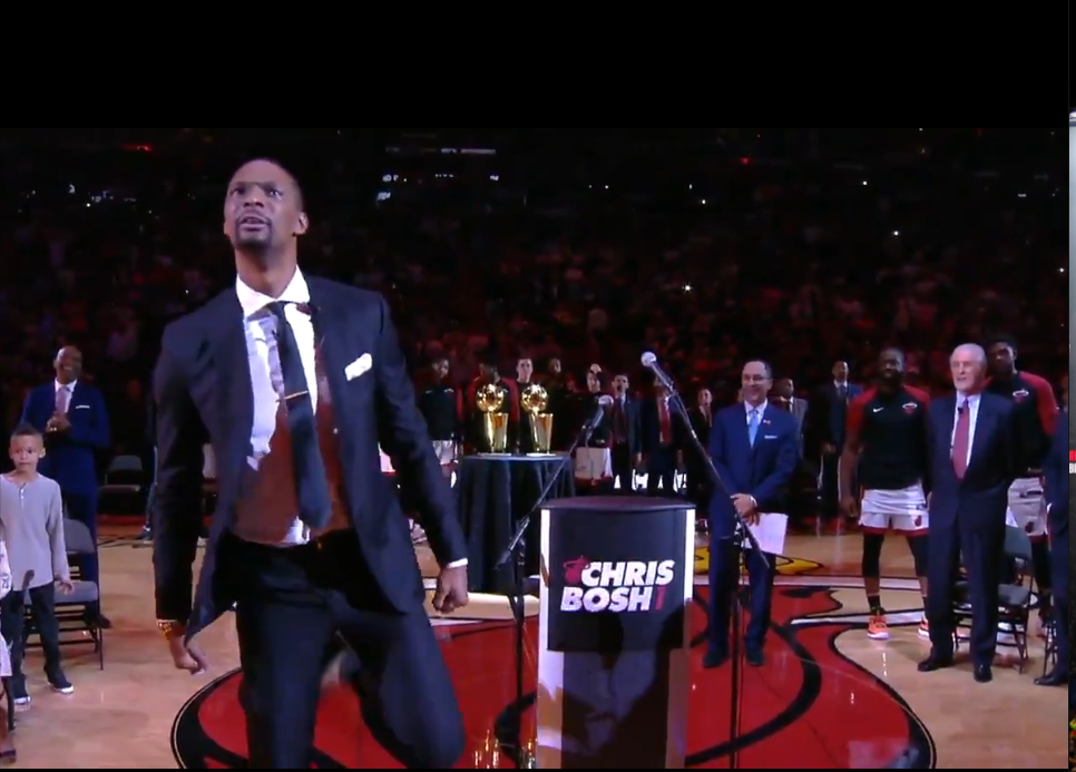 在今天退役现场,总经理帕特-莱利现场致词,为这位曾经为热火带来无数荣誉的功勋球员送上祝福。热火队现役球员集体为波什致敬,曾经热火的三巨头、2003年黄金一代的德维恩-韦德,在职业生涯的最后一个赛季,今天以球员的身份现场回忆了当年与波什的一些珍贵回忆,并衷心感谢波什在迈阿密的六年陪伴。