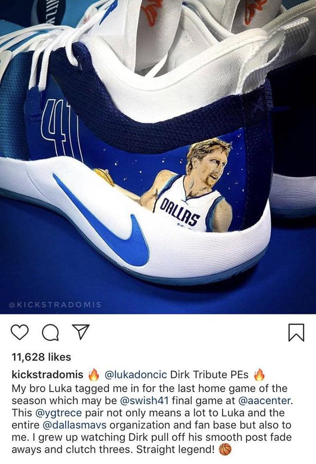 今天独行侠主场将安排对诺天王特别的致敬仪式,而赛前,卢卡-东契奇也选择了一双定制版球鞋来致敬天王,鞋上印有老司机头像。