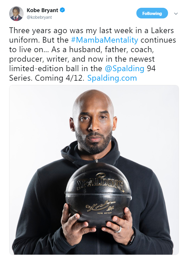 科比在自己的推特上写道:“三年前,是我穿着湖人队服的最后一周。但曼巴精神,却一直以一个丈夫、父亲、教练、制作人和作家的身份存在着。现在,则是一个限量版的斯伯丁篮球。它将于4月12日面世。”
