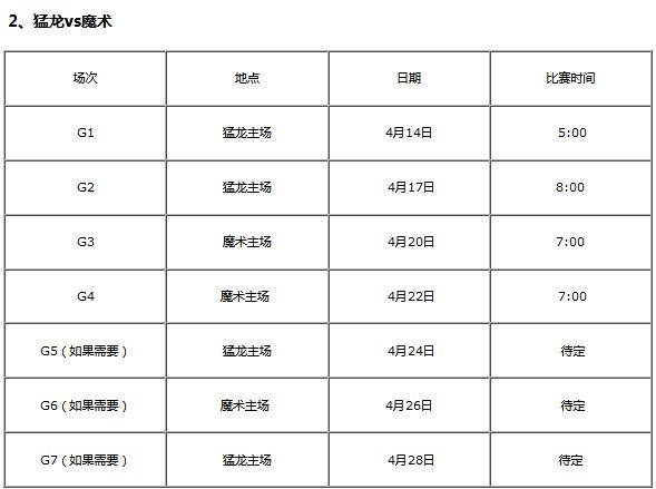 4月14日当天一共有4场比赛,除了凌晨2点30分的76人对阵篮网之外,凌晨5点东部第2的猛龙将在主场迎战东部第7的魔术队。
