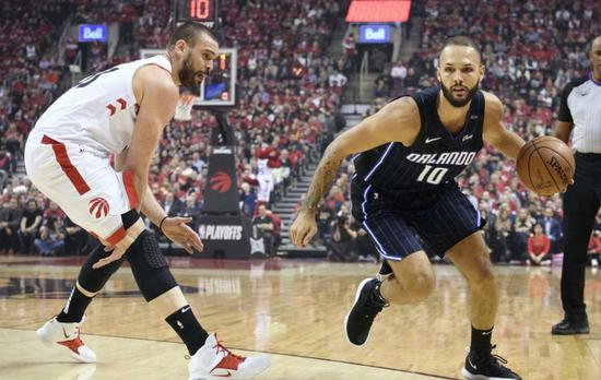 比赛的第一个回合,魔术队就开始坚决执行他们的挡拆战术,目的就是为了给武切维奇制造投篮的机会。武切维奇投篮区域遍布整个半场,三分球命中率都达到了36%,因此魔术队这么做没有问题。