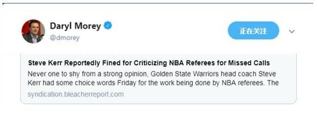 但科尔话音刚落,莫雷就予以回击。他立刻在推特上转发了一篇2016年的报道,标题为《史蒂夫-科尔因抨击裁判漏判而遭到联盟罚款》。