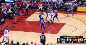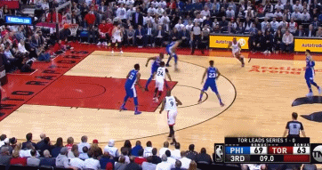 约迪-米克斯在弧顶与科怀-伦纳德完成手递手传球后习惯性的溜到了左侧底角三分线外。显然此时处在强侧的伦纳德也看到了队友的走位,当他突入禁区面对76人的三人夹击时他成功的把球传到了米克斯的手中。后者调整了一下,面对着空旷的防守,把球投了出去。