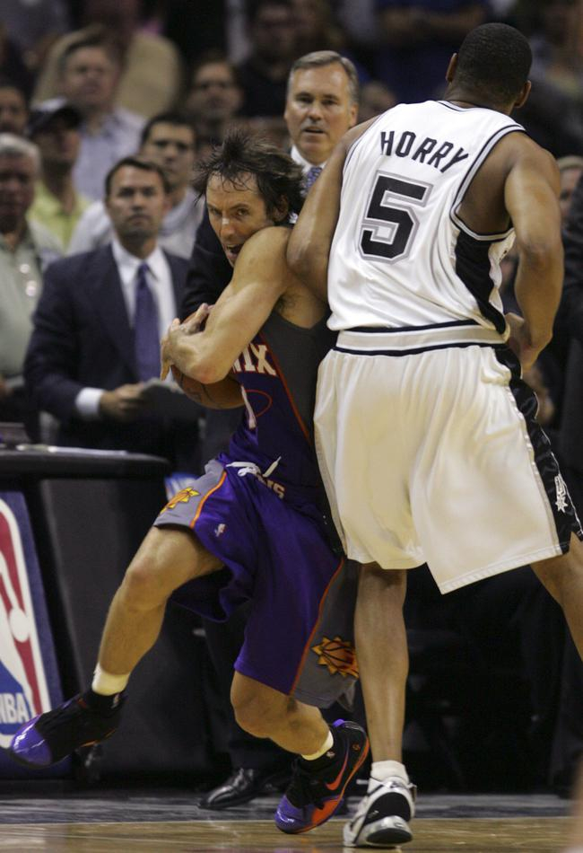 相比于两位詹姆斯,风之子纳什绝对是最惨的!07年第二轮打马刺第四场,纳什在最后一个回合被霍利撞飞到技术台上,整个脸顷刻间血肉模糊!虽然他本人坚持带伤作战,但为他出头干架的小斯和迪奥却被禁赛,天王山太阳只剩7人能打,最终输掉了系列赛!霍利这一撞,可是把纳什撞得终生无冠!