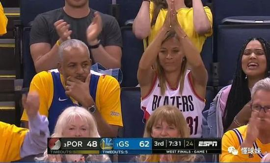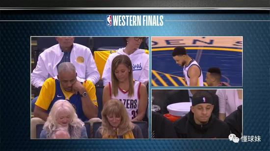 估计也是比赛太无聊,ESPN的现场导播,基本每隔2秒钟,就会切一下观众席的库里家族。