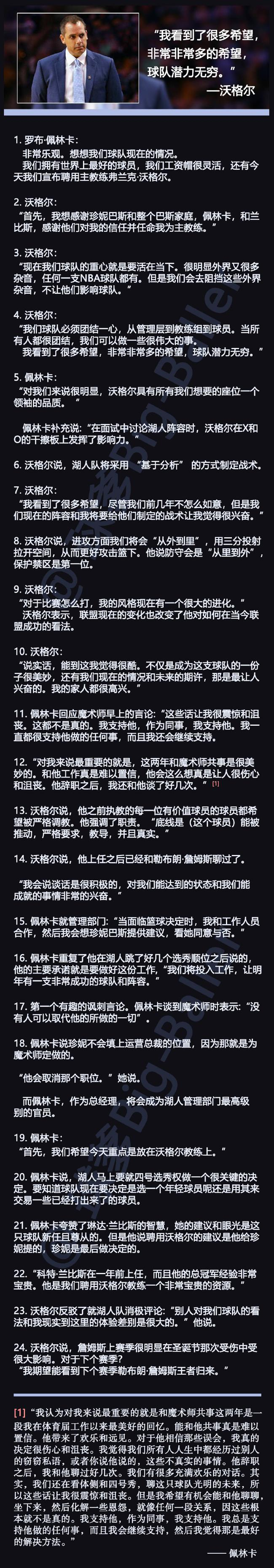 “我认为对我来说最重要的就是和魔术师共事这两年是一段我在体育届工作以来最美好的回忆。能和他共事真是难以置信。他带来了欢乐和远见。对于他相信那些误会,我真的决定很伤心和沮丧。我觉得我们所有人人生中都经历过别人的窃窃私语,或者你说他说的,这些不真实的事情。他辞职之后,我和他聊过好几次。我们有很多充满欢乐的对话。其实,我们还在看体侧和四号秀,聊这只球队光明的未来,所以这些话让我很震惊和沮丧。但是我希望有机会能和他聊聊,坐下来,然后化解一些恩怨,就像任何一段关系,因这些根本就不是真的。我支持他,作为同事,我支持他。我总是支持他做的任何事,而且我会继续支持,然后我觉得那是最好的解决方法。”