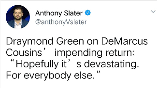 考辛斯常规赛回归的时候格林对媒体说:地狱大门打开了,这对每个球队都是毁灭性打击。未曾想到受打击最深的却是勇士队自己。