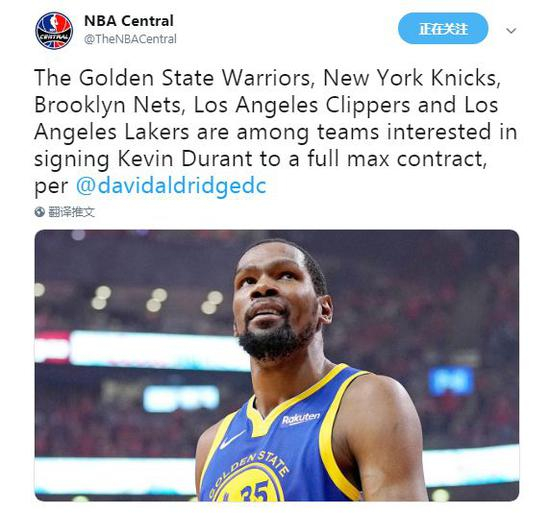 跟腱受伤伤势未明,但并不能阻挡洛杉矶以及纽约地区球队对杜兰特的追逐
