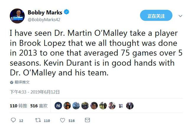 “我目睹了马丁-奥马利医生在2013年为布鲁克-洛佩斯做手术,当时我们都觉得洛佩斯的职业生涯已经结束了,但是在过去5个赛季,他每个赛季场均出场75次。凯文-杜兰特把跟腱手术交给奥马利和他的团队来操刀,是很明智的选择。”鲍比-马克斯在推特上写道。