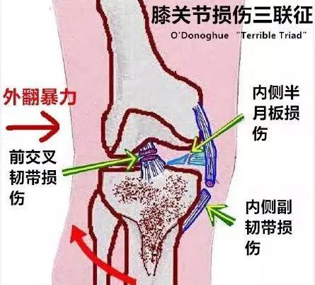 从汤神落地的动作可以看出,膝盖处于一个膝关节半曲外翻大腿内旋的动作,这个动作一旦受力过多,就会引申成为可怕的膝关节三联症!