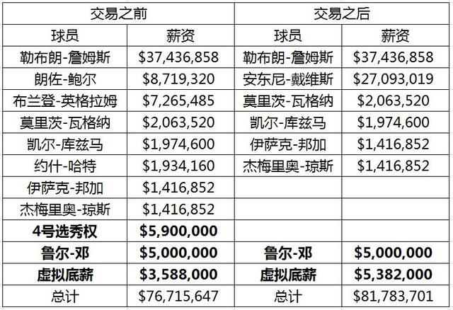 3、那么接下来需要做的事情就是配平。瓦格纳206万美元、邦加和琼斯均为141万美元,加上鲍尔英格拉姆和哈特的薪资,合计2282万美元,符合薪金对等原则。