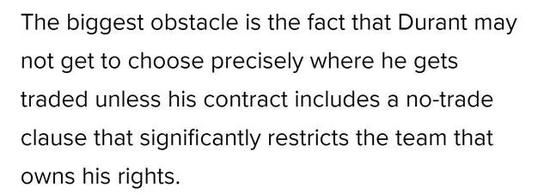 B/R认为比较稳妥的一种方式,是这份合同内包含一个交易否决权,这样至少可以避免杜兰特在合同期内被交易到一支他不想效力的球队。
