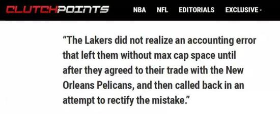 湖人在达成和鹈鹕的交易协议后,才发现自己并没有签下第三巨头的足够空间,于是他们赶紧再找鹈鹕商量,比如推迟交易完成日期,寻求补救的措施。
